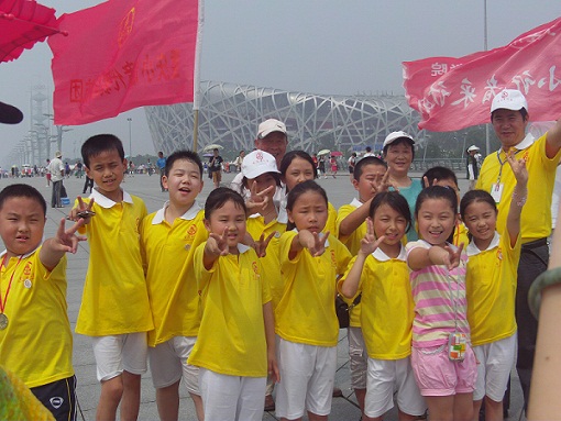 小记者与老师在“鸟巢”前留影
