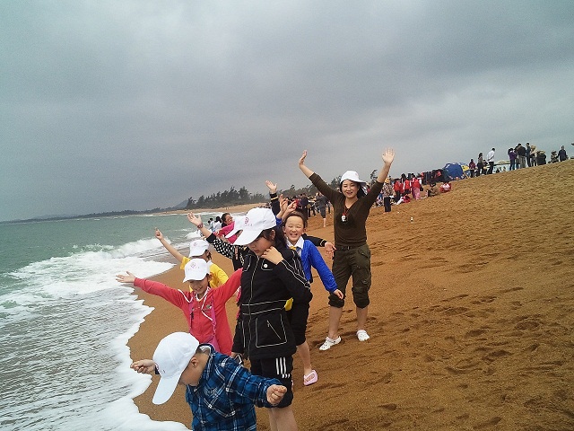 2012寒假海南玉带滩,小记者与刘老师留影。