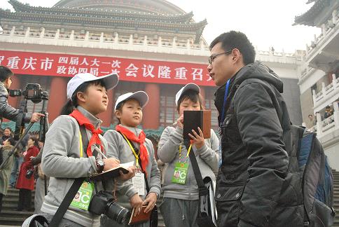 图为(左一刘影、左二秦怡然、右二周心甜):小记者两会采访大记者。 本报讯(重庆小记者 刘影) 2013年1月26日上午9点,重庆市第四届人民代表大会第一次会议在重庆市人民大礼堂隆重召开。这次大会迎来了来自中国人民大学·中国少年报社 少年新闻学院重庆分院的3名小记者,他们也是重庆江北区华渝实验学校和新村小学的在校学生。这三位小记者身着统一小记者服装,身挎照相机,手拿采访本和笔,在大会上是一道美丽的风景线。他们得体的言谈、远大的理想、不怕吃苦、努力学习的精神迎得了参会代表、委员、旁听者以及大记者的高度赞扬。 据了解,小记者参加重庆市第四届人民代表大会采访乃属首次。 |